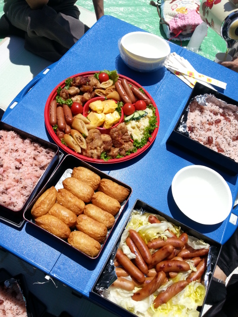 これに~果物は、バナナあったり、おやつやジュースが大量にあり、お昼終わる頃には、父があまりの暑さに、アイス購入してきたりしてました。