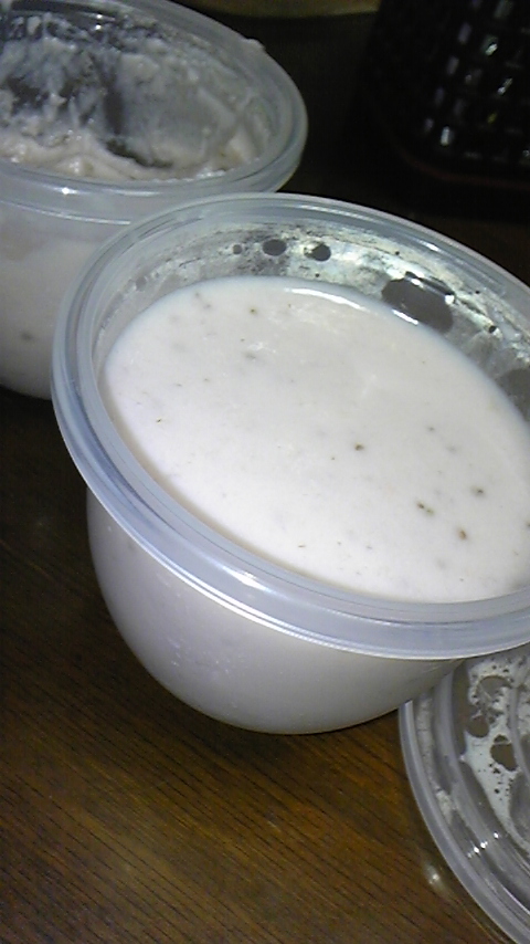 そうそう・・・生クリームが 果物を入れたことで、ちょっとゆるめになってしまいまして・・・溶かしたゼラチンを足して入れて混ぜてみてます。