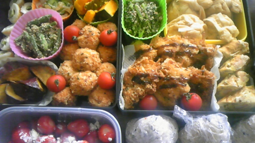とりあえず、大き目の重箱2段分は、ほぼ完成。あとは、卵焼きなど~。
