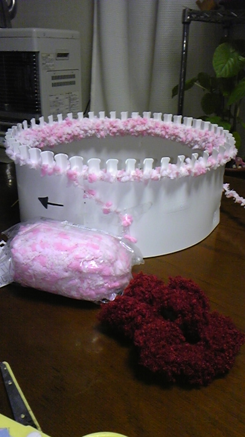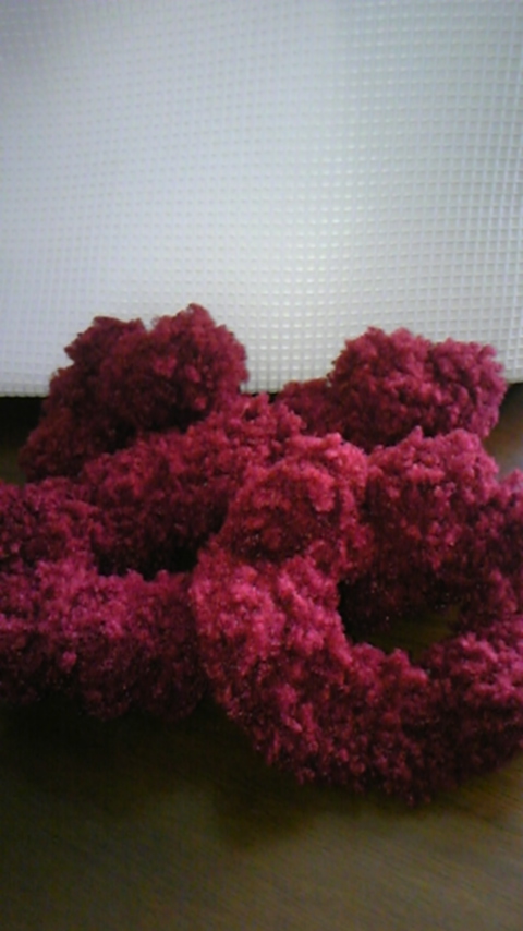 左下2~真っ赤なふわふわな毛糸で作った 編みシュシュ。シュシュを編むのは 実は初めて!