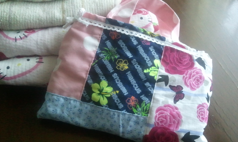 生地も ハギレをパッチして~テイストが合ってるのか??どうかもわからないような感じだけど、ちゃんと中生地もつけてみました。持ち手は、娘のエプロン作った時、結ぶヒモが長すぎちゃって、切ってそのまま 裁縫箱にあったもの。