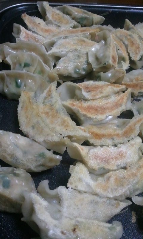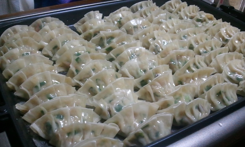 夫は、第2部隊ってことで、冷凍庫に入れた皿に並べた餃子をまた並べて焼いて~って感じ。