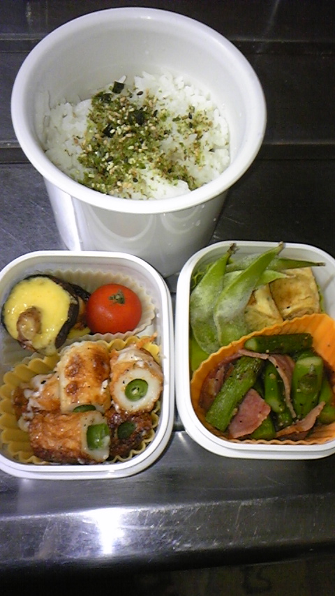 ちくわのチーズ焼き:ちくわの真ん中に、冷凍インゲンを入れ、適度に切って焼き、溶けるチーズをのせ、塩・こしょうで味付けして、からませたもの。ちょっと焼き過ぎでした(-_-;