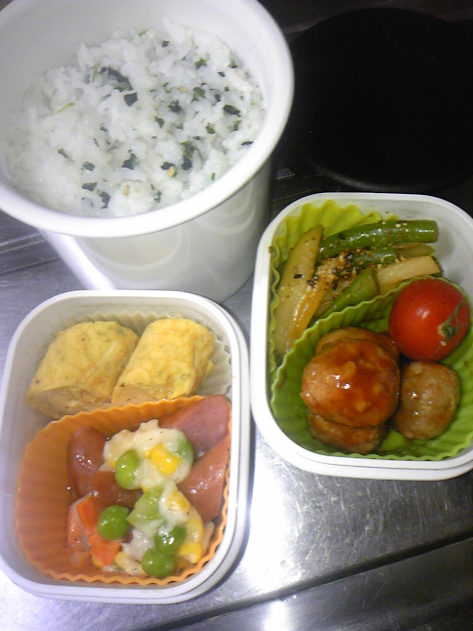 ハンバーグ:こちら 普段作るハンバーグの残りのタネをお弁当用に小さくして、冷凍してあったもので、1分半くらいチンして、焼き目をつけるだけ。